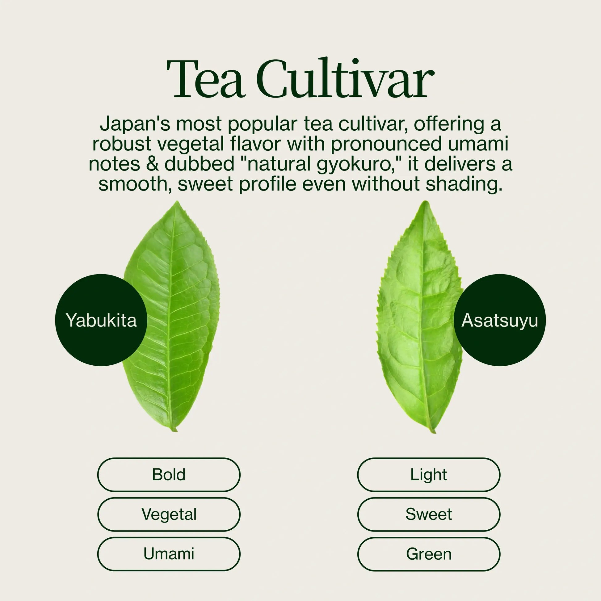 Asatsuyu on the other hand is a more mild and delicate cultivar that provides a sweet taste. It is known as a “natural gyokuro” because it maintains this nice sweet flavor even without the long shading process. This is the perfect tea varietal to balance out the slightly more grassy flavors of the Yabukita.