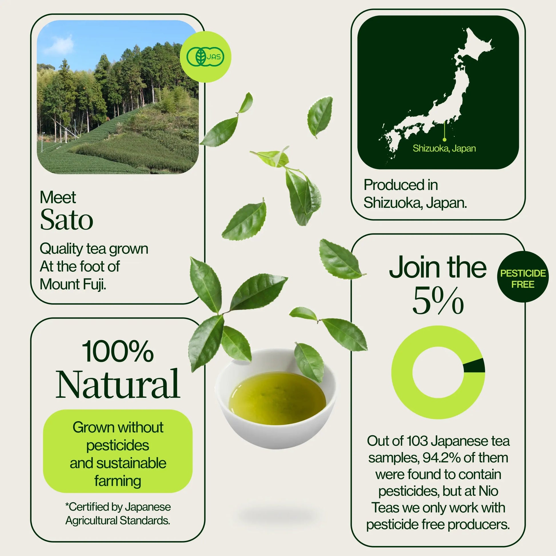 When we source tea, it is important to have verification that the tea fields do not contain pesticides or chemicals. The larger tea farmers we work with are able to pay for soil samples and testing, so we require them to produce the JAS label.